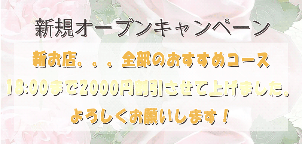 | 待 遇: | 完全全額日払い制 優しく笑顔でお客様に接客できる方、おしゃべりが好きな方。 出勤後に一時外出することもできます。 指圧整体等の経験者は優遇させていただきます。 |